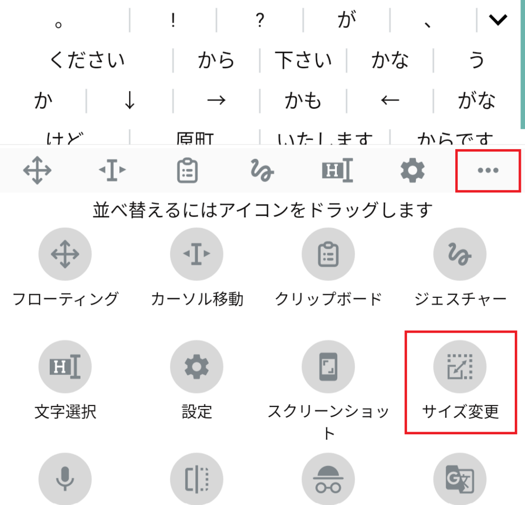 キーボードの右上をタップし「サイズ変更」を押下します。サイズ変更の枠がでましたらハンドル部分をタップし上下にスライドさせます。