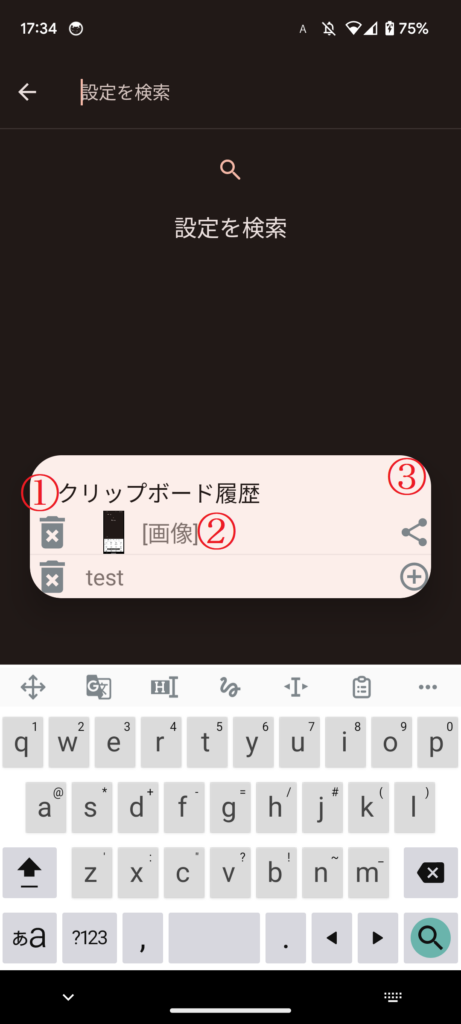 | スクリーンショット | スクリーンショットをクリップボードへ保存します 「他のアプリの上に重ねて表示する」権限と「録画やキャストを開始」の承諾が必要です |