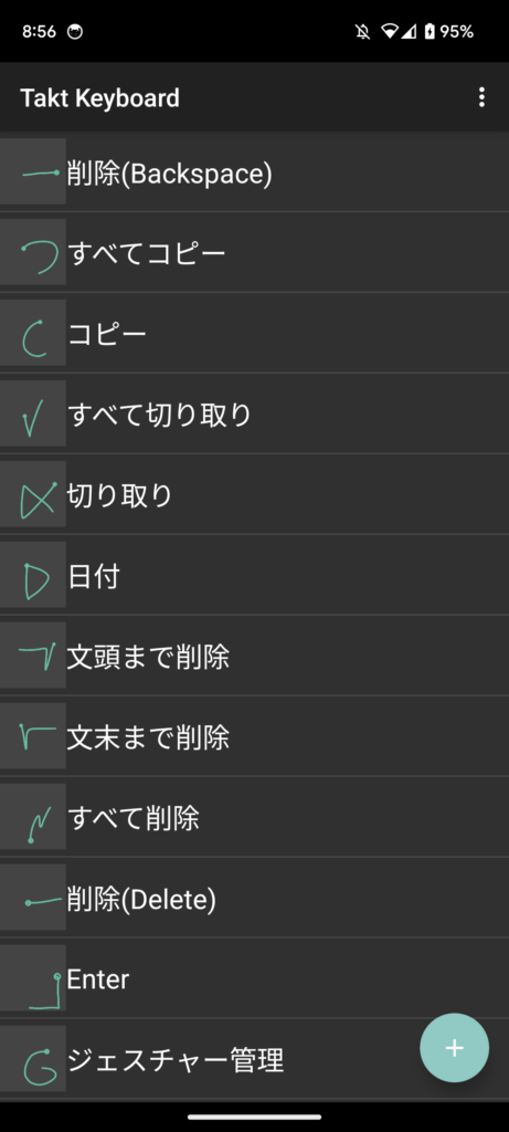 真ん中の画像の中央にジェスチャーを描き保存ボタンを押下します。ここで描いたものをキーボード上で描くと機能を呼び出すことができるようになります。